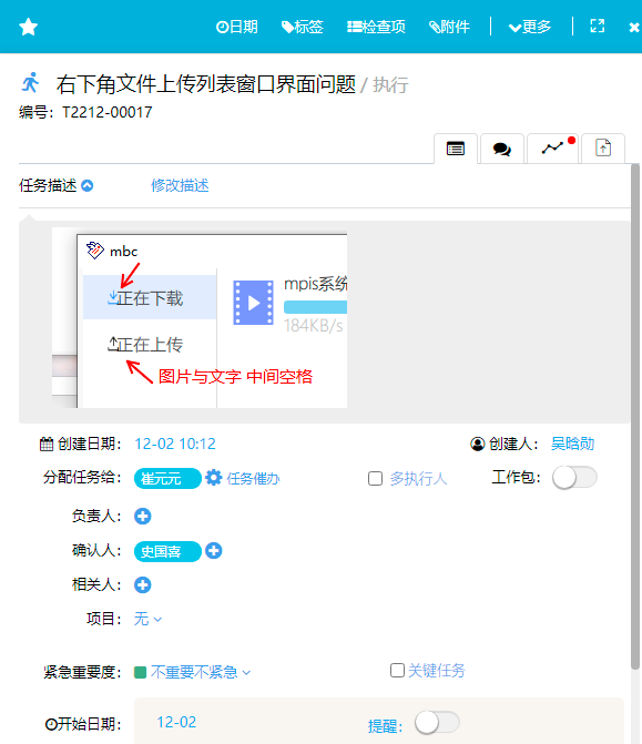 新到達任務點擊確認后任務進入執行階段,在執行過程中任務的關聯人(創建者,執行人,相關人)之間可以圍繞這個任務展開交流。可以在我的任務,我創建的任務,任務看板,相關任務中點擊任務項后查看任務,并對任務進行交流,任務的顯示頁面如下圖所示。