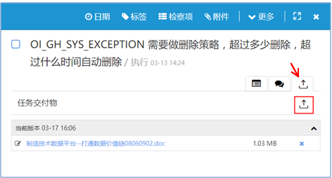 點上圖中的紅色框線區域的“上傳”按鈕即可選擇文件進行上傳,上傳成功后會在任務交付物 列表中顯示。 如果要刪除交付文件,點擊交付文件后面的“刪除”按鈕。