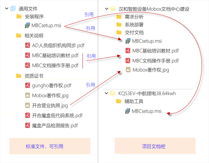 Mobox的引用文件管理功能與制造業中的借用件管理很相似。完美的解決了一個文件在不同文檔柜、文件夾中的多次出現(降低的存儲空間),也可以實現原始文件修改后,引用該文件的文件夾內的文件也會自動更新。