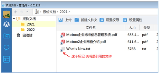 這種管理方式好處是簡單,壞處是無法體現這是一個相同的文件。Mobox文檔管理系統可以很好的管理這類文件。我們的相同文件存放在不同的文件夾,采用了引用文件的方式來管理。