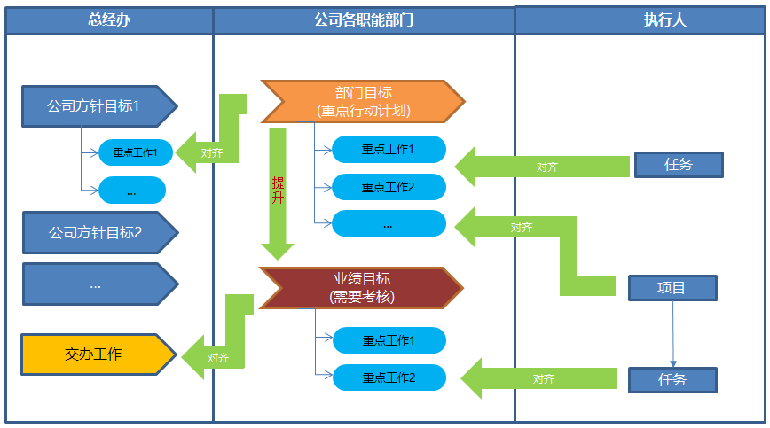 以公司戰(zhàn)略目標為導(dǎo)向,承接公司管理層考核要求,自上而下推進、自下而上支持,做到“計劃有源頭、執(zhí)行有力度、成果有考核”。構(gòu)建以“企業(yè)戰(zhàn)略目標” 為主線,“工作任務(wù)” 為驅(qū)動的重點工作管理平臺